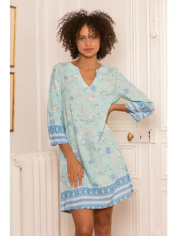 Prachtige Bohemium Ibiza dress met V-hals en uitlopende mouwen van het Franse merk The Last Queen Paris verkrijgbaar in de maten