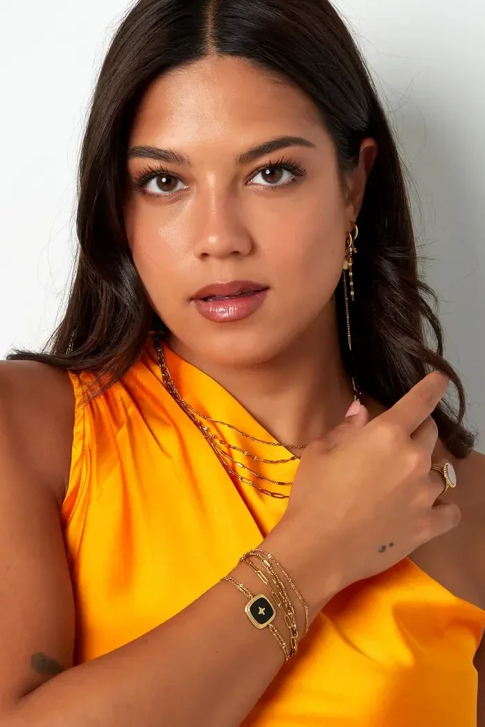Ben jij op zoek naar een gouden vrolijke armband voor jouw shop? Dan is deze armband met drie drukke armbandjes echt iets voor jou! De armband heeft een speels uiterlijk en kan leuk gecombineerd worden met stoere jeans en sneakers of juist met een zomers jurkje. De armband is gemaakt van Stainless steel en heeft een verstelbare afmeting vanaf 16 t/m 19 cm. Verkrijgbaar in de kleuren zilver en goud.