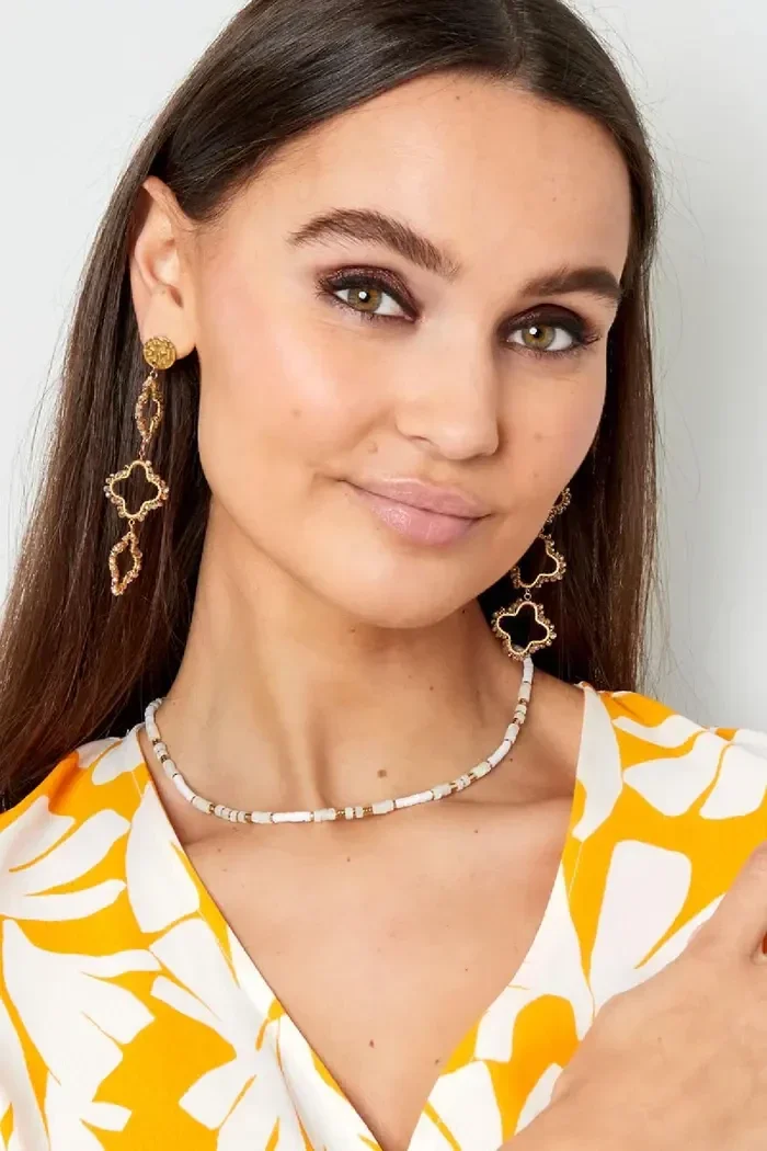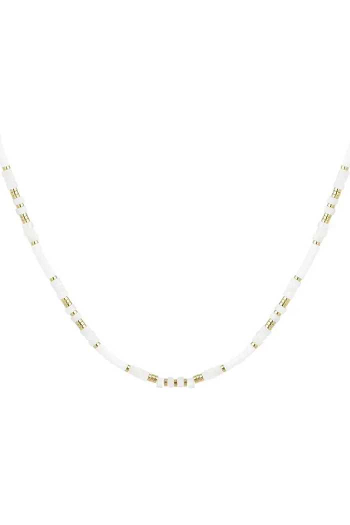 Hoe leuk is deze prachtige kralenketting in de kleuren wit en goud! Deze ketting zorgt voor een vrolijke look. Kralenketting kleur is gemaakt van Stainless Steel, hematiet, polymeerklei en steentjes en heeft een afmeting van 38 cm, verstelbaar tot en met 43 cm.