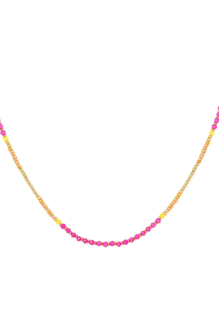 Wauw! Wat een plaatje is deze prachtige kleurrijke kralenketting. De ketting met leuke kraaltjes in de kleuren oranje en roze kun je perfect combineren met allerlei gouden en zilveren sieraden en is daarnaast ook leuk te combineren met andere fel gekleurde sieraden. Zo kun je deze ketting onbeperkt combineren! De ketting is gemaakt van glaskralen, kristalkralen, hematiet en Stainless Steel. De ketting heeft een afmeting van 38 cm, verstelbaar tot en met 43 cm. Verkrijgbaar in de kleuren roze/wit - geel/wit - roze/oranje.