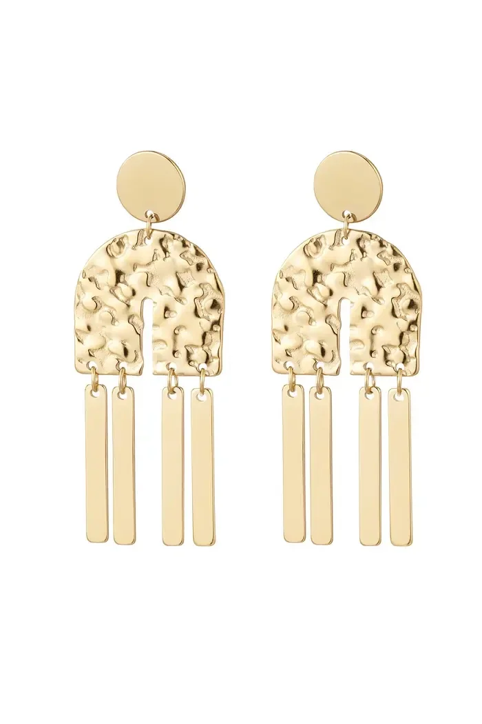 Wauw! Deze gouden statement hoops met leuke versiersels in de vorm van een halve boog en streepjes zijn perfect voor een tof feestje of festival! Zo kun je deze oorbellen enkel dragen maar kunnen ze ook perfect met meerdere oorbellen gecombineerd worden voor een speelse look! De oorbellen zijn gemaakt van Stainless steel en hebben een afmeting van 4,6 cm.