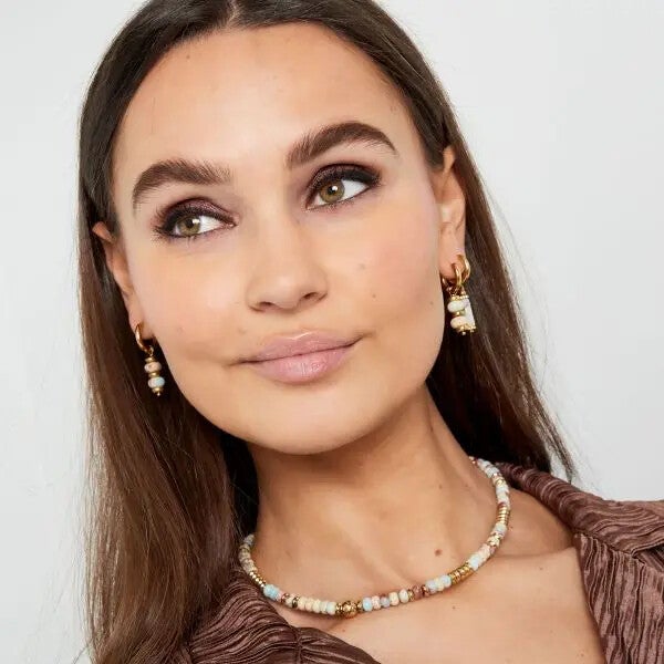 Hoe leuk zijn deze oorbellen met witte steentjes en gouden bolletjes. Oorbellen met stenen bolletjes zijn perfect voor elke gelegenheid! De oorbellen zijn uitstekend casual te dragen maar kunnen ook zeker geschikt zijn voor een feestje. De oorbellen zijn gemaakt van Stainless Steel en hematiet in combinatie met steen en hebben een afmeting van 3,8 cm. Verkrijgbaar in de kleuren lichtblauw - wit - cognac.