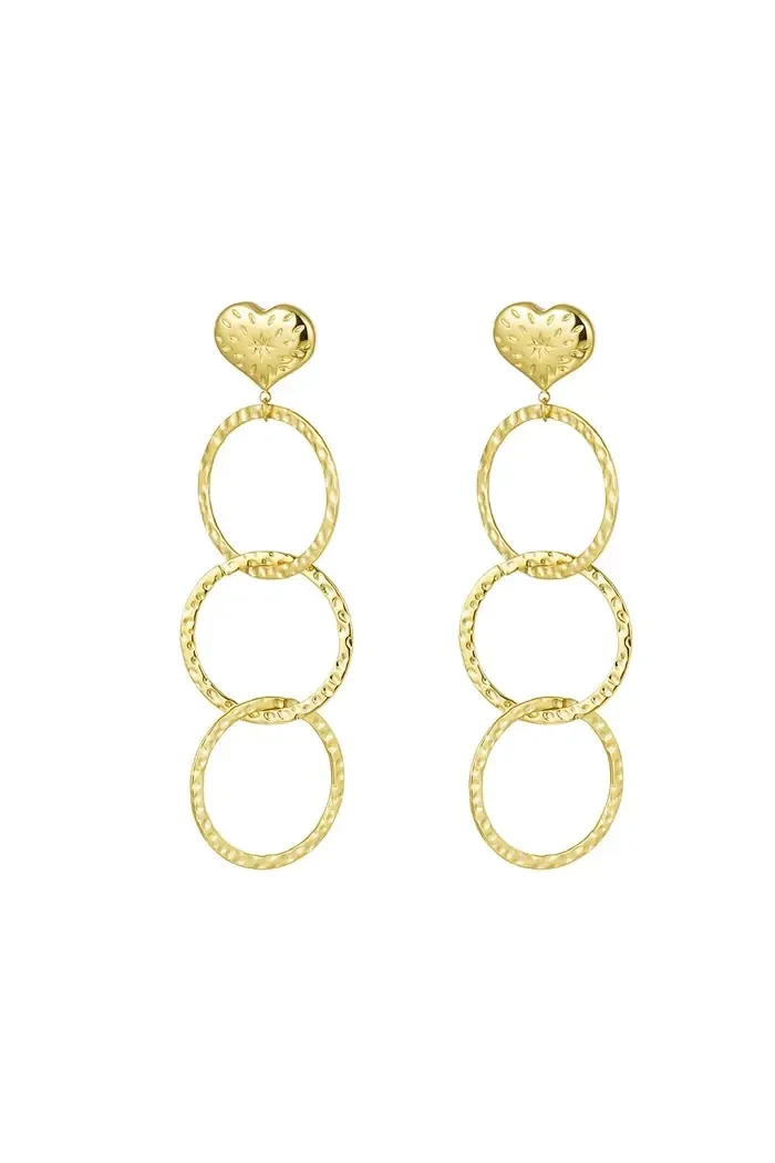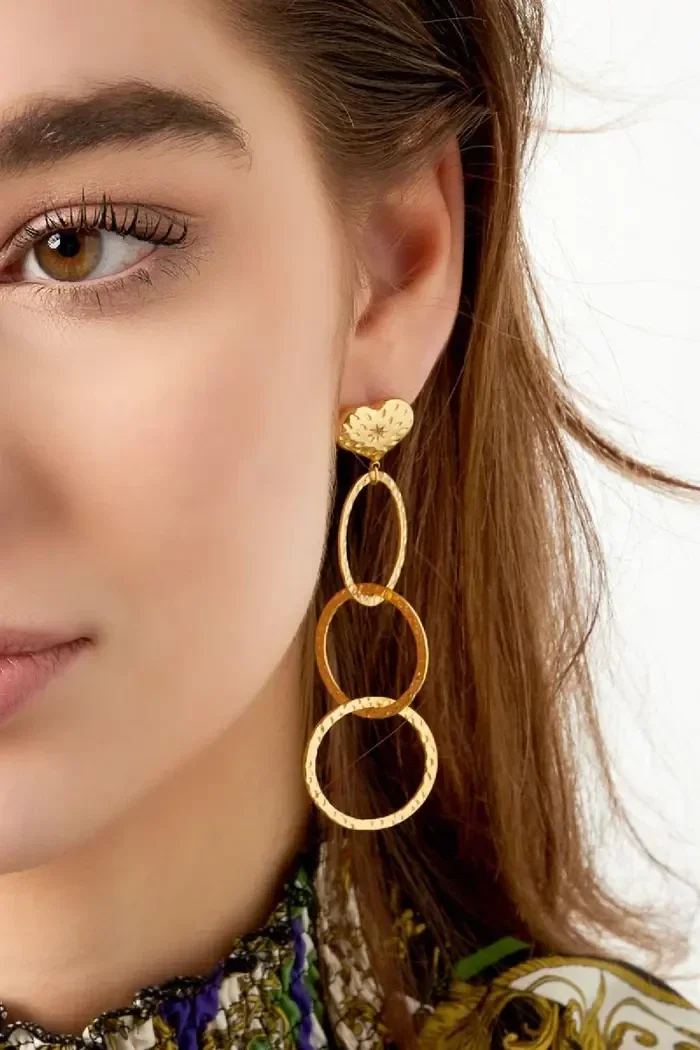 Hoe tof zijn deze gouden statement oorbellen met drie grote cirkels met print en een hart van Yehwang! De oorbellen zijn perfect te dragen tijdens een feestelijke gelegenheid. Dankzij deze prachtige statement oorbellen kan niemand meer om jou heen! De oorbellen hebben een lengte van 8,24 cm en zijn gemaakt van Stainless Steel. De oorbellen zijn verkrijgbaar in het goud en zilver.