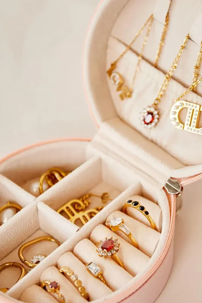 Ronde sieradendoos. Perfect om je favoriete sieraden in op te bergen als je onderweg bent.