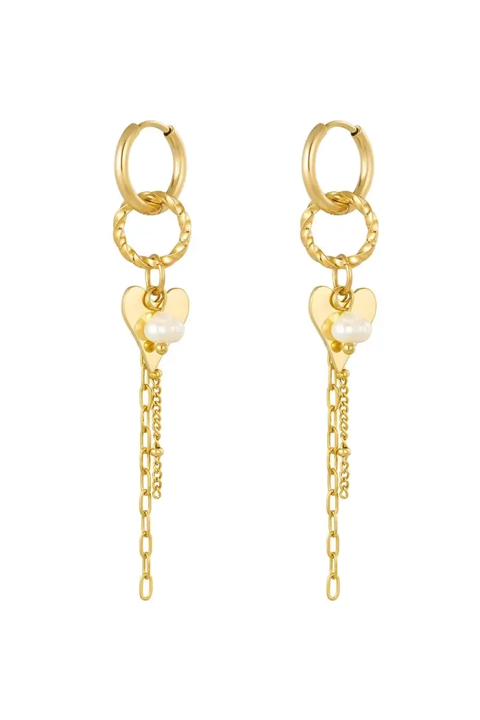 OMG! Hoe tof is dit gouden paar oorbellen met meerdere kettinkjes, ringetjes, parels en een hartjes bedel. De oorbellen zijn mega trendy en zijn de musthave voor een tof feestje of festival. Erg leuk om deze oorbellen te combineren met meerdere matchende sieraden. De oorbellen zijn gemaakt van stainless steel in combinatie met parels en hebben een afmeting van 6,4 cm