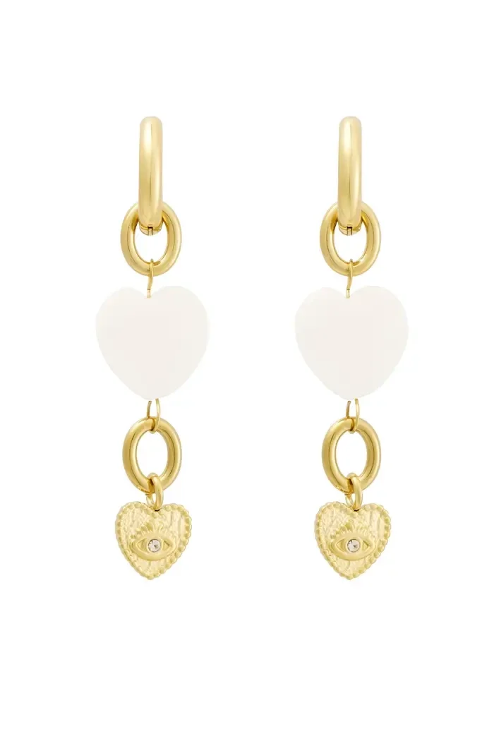 Hoe tof zijn deze gouden statement oorbellen met verschillende hartjes, ook in de kleur wit van Yehwang! Mega trendy en superleuk te combineren met meerdere matchende oorbellen of andere sieraden. De oorbellen zijn zowel zeer geschikt voor alledaagse als feestelijke momenten en hebben een afmeting van 5,4 cm. De oorbellen zijn gemaakt van stainless steel en strass steentjes en zeeschelp