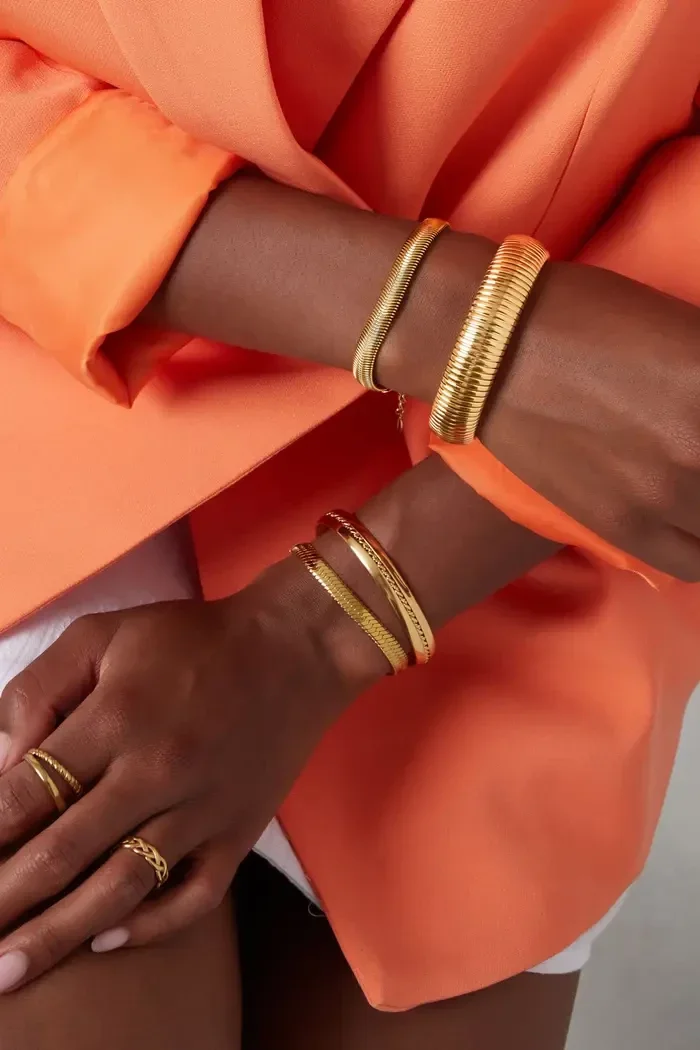 Wauw! Hoe tof is deze gouden platte armband met structuur. Erg trendy en mega leuk te combineren met meerdere sieraden en accessoires. Deze prachtige armband is gemaakt van Stainless steel en heeft een afmeting verstelbaar van 16,5cm tot en met 19,5 cm, ideaal