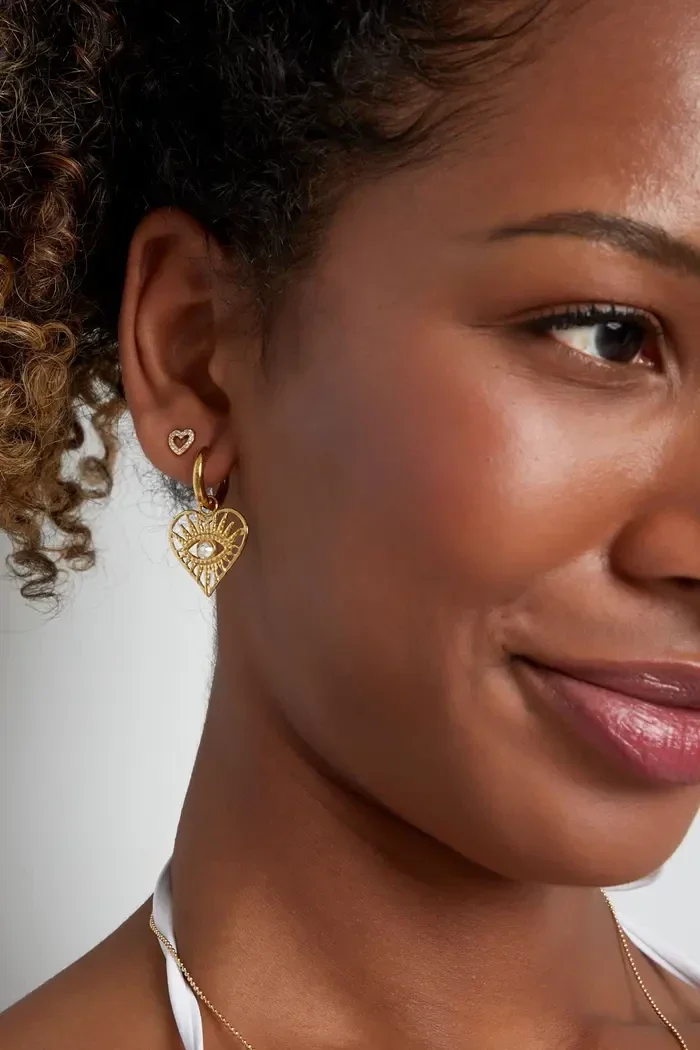 Wauwie! Shop deze leuke speelse gouden oorbellen met een bedel in de vorm van een hart met oog nu bij Beauty's! De oorbellen zijn super trendy en zijn het perfecte paar statement oorbellen die jij in huis wilt hebben! De oorbellen zijn gemaakt van Stainless steel en strass steentjes en hebben een afmeting van 3,5 cm, ideaal te combineren met meerdere kleine oorbellen.