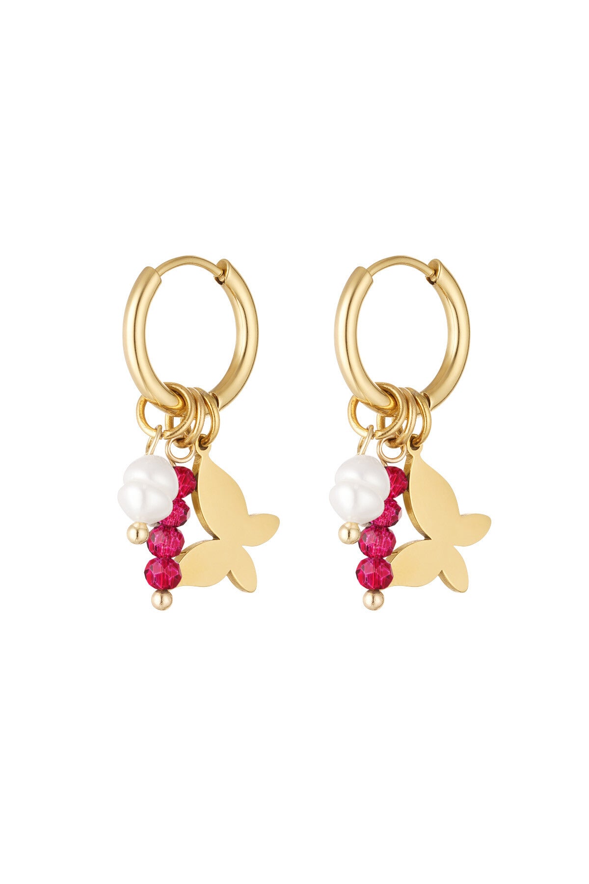 Check deze prachtige gouden oorbellen met vlinder bedel en paarse kraaltjes van Yehwang! Superleuk te combineren met meerdere sieraden met kleurtjes en daarnaast perfect cadeau te geven. De oorbellen kunnen leuk gecombineerd worden met meerdere oorbellen voor een speelse look. De oorbellen zijn gemaakt van stainless steel, parels en glas kralen. De oorbellen hebben een lengte van 2,8 cm en is verkrijgbaar in de kleuren: goud/groen, goud/roze en goud/paars! Shop jouw favoriet.