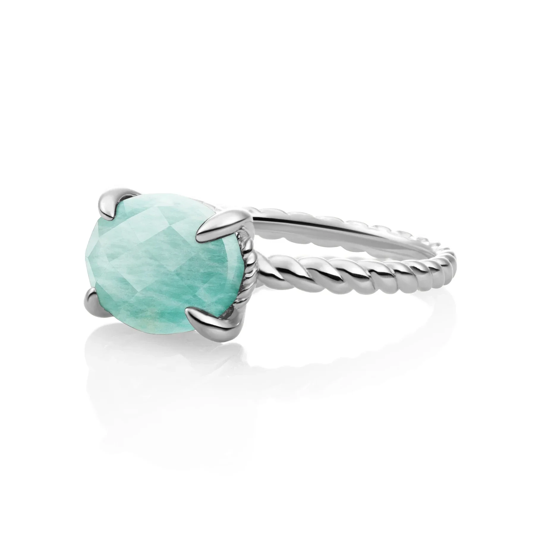 De Twist Ring met Rich Green Amazonite edelsteen is dé perfecte aanvulling op jouw sieradencollectie. Een echte eyecatcher; stijlvol en tijdloos. Dit pareltje van 925 Sterling Zilver is handgemaakt en ingezet met een prachtige facet geslepen Rich Green Amazonite edelsteen. Draag de Twist ring enkel of Mix & Match met een van onze Essential ringen.