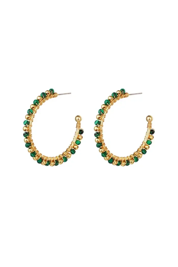 Hoepeloorbellen met kleurrijke kraaltjes. Gemaakt van koper en verkrijgbaar in zilver met zwarte kralen of goud met roze, groene of blauwe kralen.