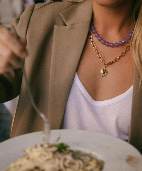 Add a bold pop of Violet colors to your look with our Vintage Violet Necklace. With it's vibrant beads it matches perfectly with the Heritage Heart Necklace or the Baroque Coin Necklace.
