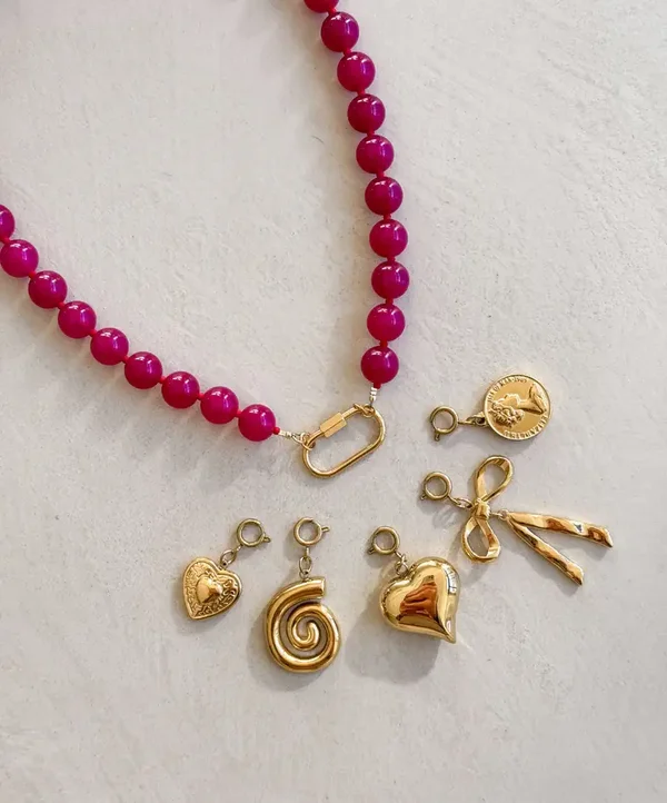 The Cerise Chic Necklace is made with bordeaux colored beads, the trend color of this season. The versitile golden clasp allows you to add your favorite charms to personalize your look or wear it simply on it's own for effortless elegance.