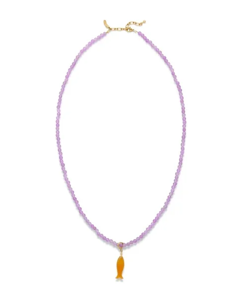 The La Pesca Necklace is a long flowing necklace and blends soft lilac beads with a fresh carnelian fish charm. Perfect for layering with the Lilac Capri Necklace or wearing on it's own.
