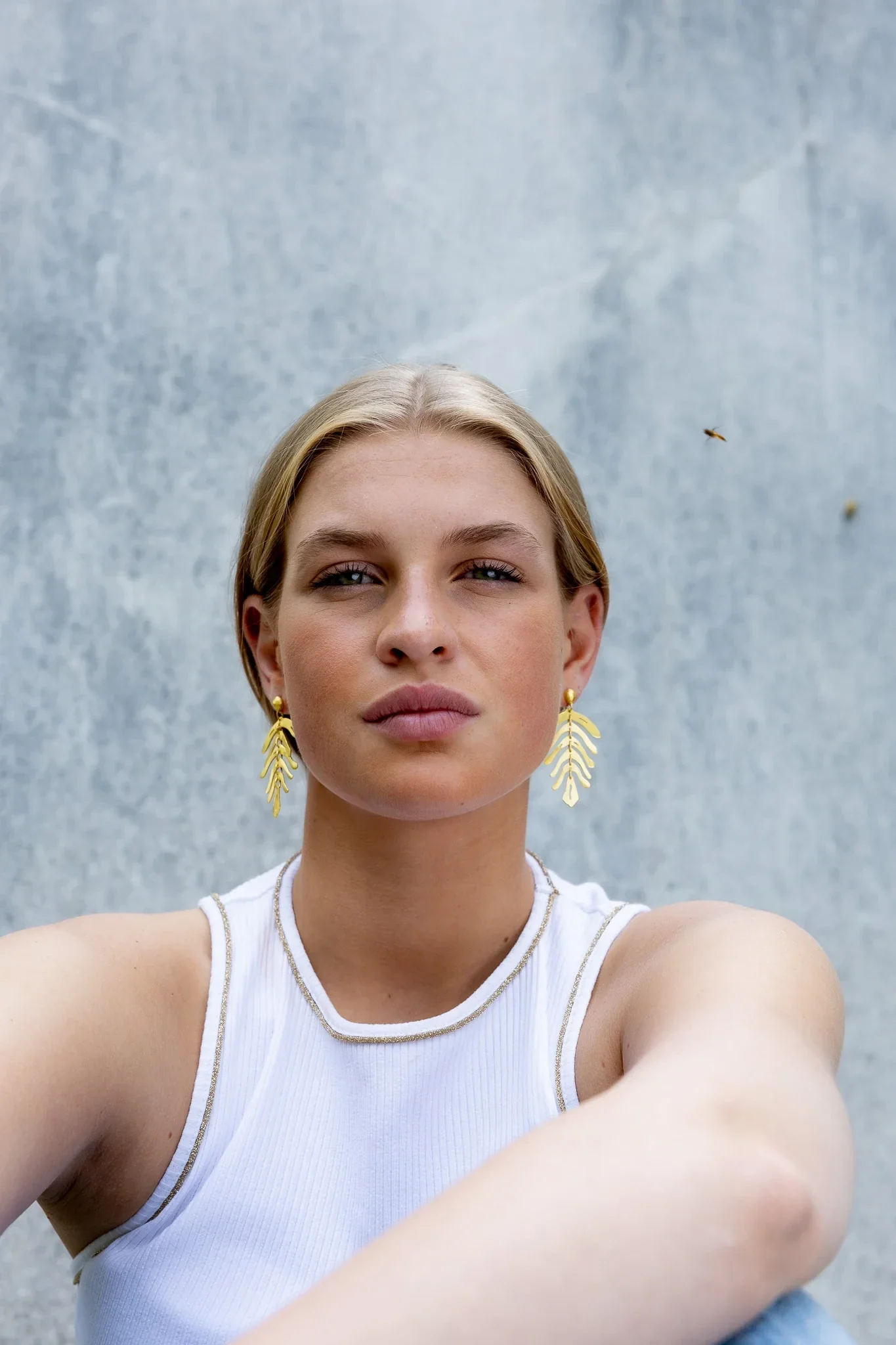 Wat een mooie soepele en lichte oorbellen! Ze zijn prachtig doordat ze flexibel zijn. Ze bewegen prachtig. Ook deze oorbellen zijn 18-karaats verguld matgeslagen met een klein gouden knopje op het oor.