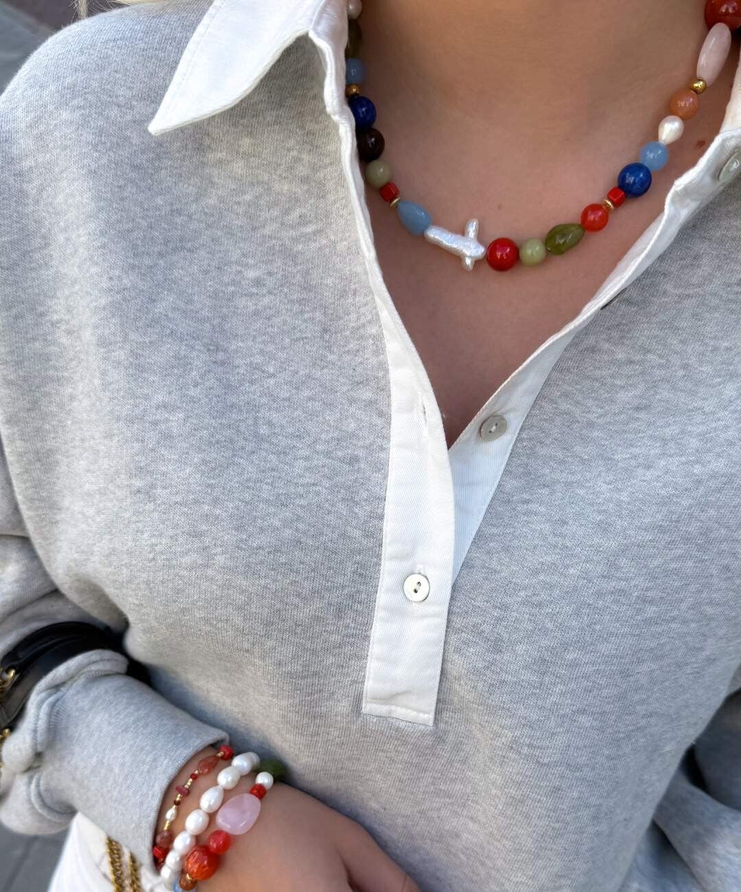 The Dreamcatcher Necklace brings together a mix of beads in unique shapes and colors, creating a playful rhythm on your wrist.