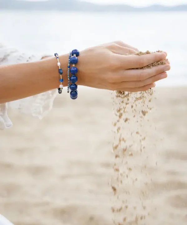 The Starlight Bracelet is detailed with sparkling golden beads, deep blue tones, freshwater pearls and lapis lazuli stars. This bracelet is designed to bring a little starlight to your everyday look.