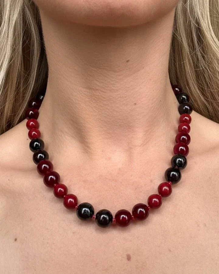 Deze handgemaakte rode kralenketting geeft kleur en diepte aan je outfit. Door de verschillende tinten rood is de ketting heel makkelijk te combineren. Perfect voor de feestdagen, en eigenlijk voor ieder ander moment wanneer je outfit iets extra's kan gebruiken.