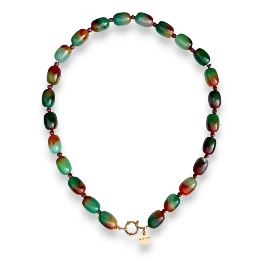 Deze rijke ketting van pauwagaat natuursteen past perfect in onze fall collectie. Door de verschillende tinten bruin en groen is deze ketting goed te combineren bij herfst outfits. De ronde sluiting kan zowel voor of achter gedragen worden en leent zich perfect om te combineren met een van onze charms.