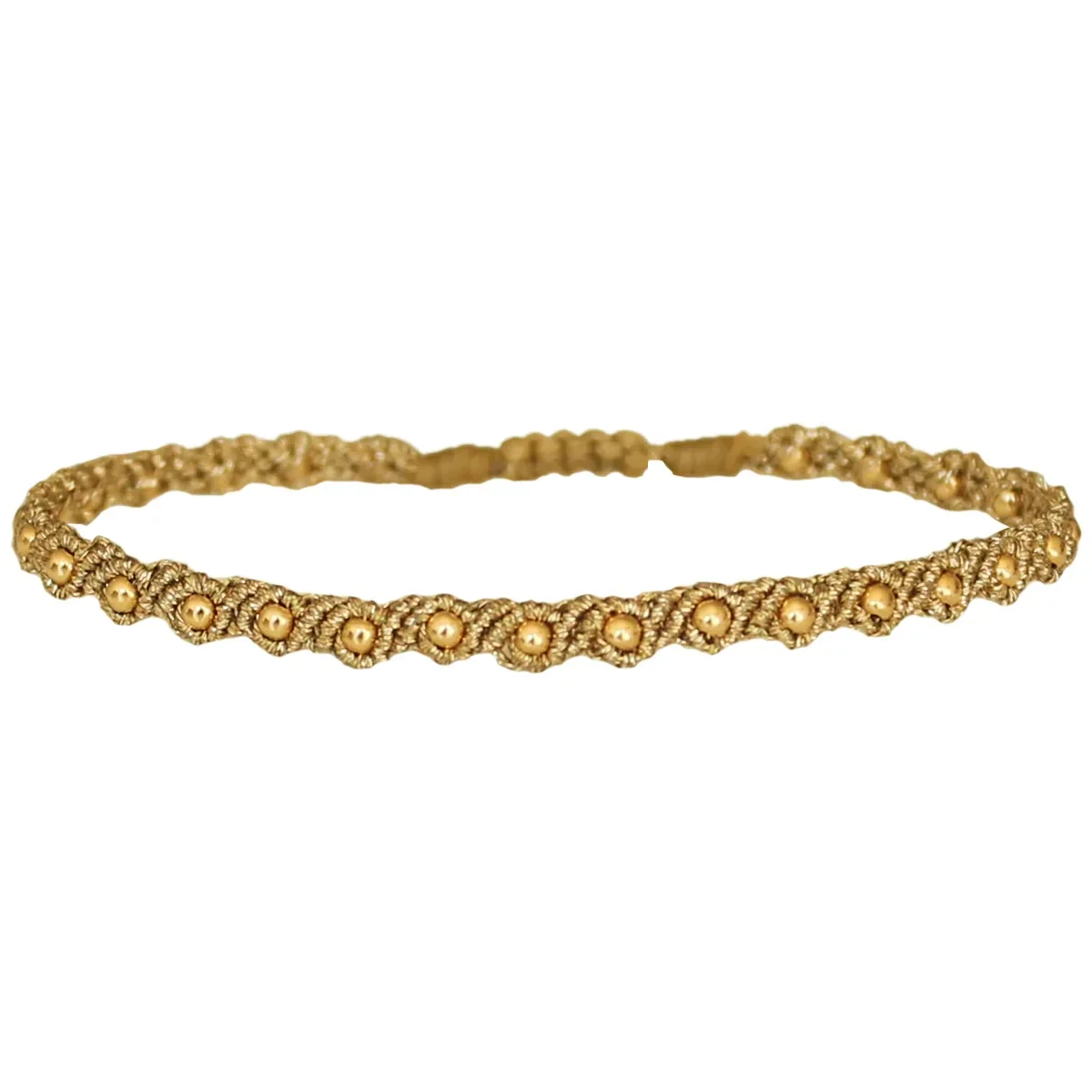 If you wish for simple elegance and versatility this handmade bracelet is just for you. It is handwoven by our team of artisans using 14 k gold beads and gold metallic threads.