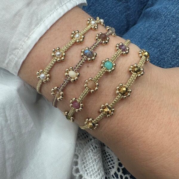 Delicate & feminine, this bracelet is handwoven using metallic gold threads and intermixed freshwater pearls and 14k gold filled beads. Wear it with your favourite accessories all season long!
