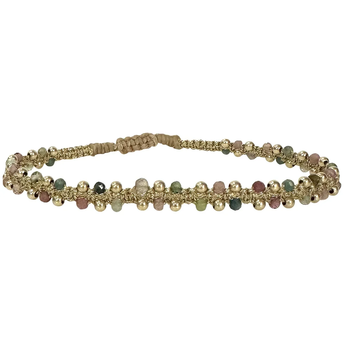 This delicate and beautiful bracelet is handwoven by our team of artisans using Watermelon Tourmaline semi-precious stones mixed with 14K gold filled beads and metallic threads.