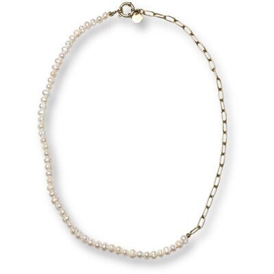 The piece is handcrafted and made of pearls and stainless steel 18K paperclip shape gold plated chain (5 mm)