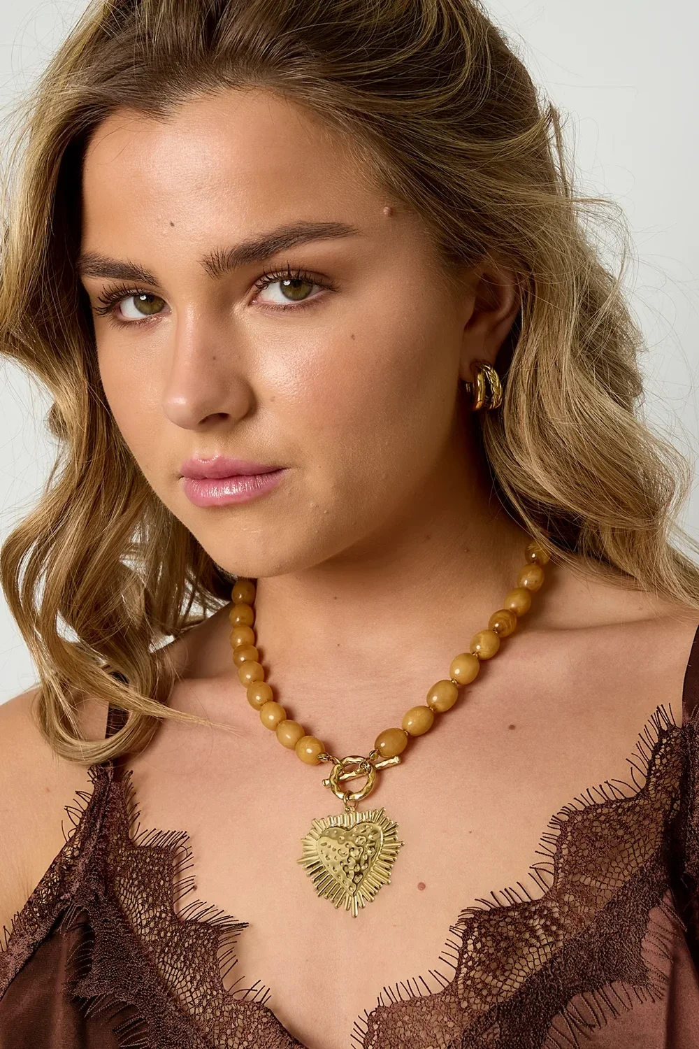 Stainless steel - ketting bruine kralen met hart