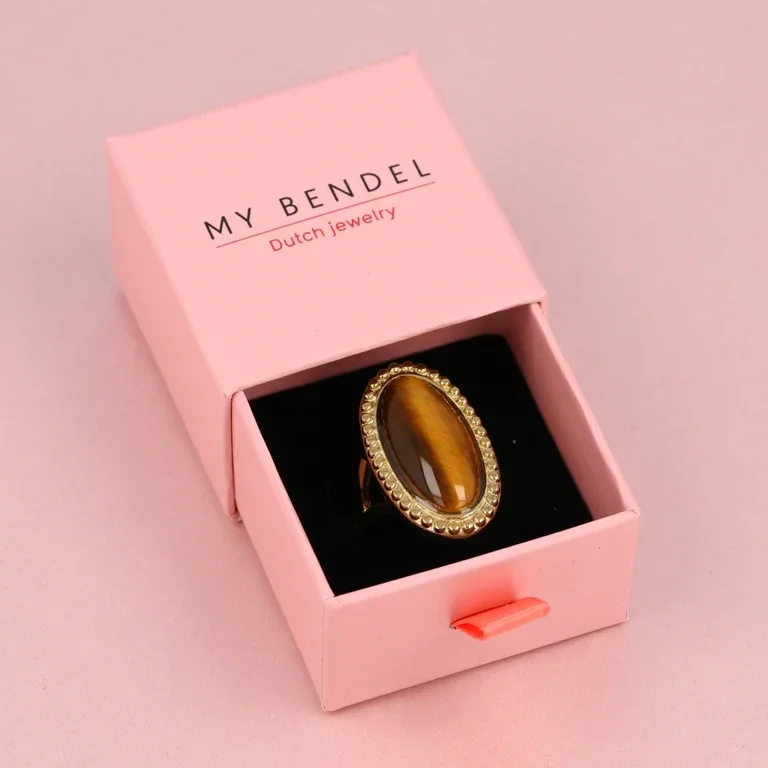 Laat je krachtig én stijlvol voelen met deze opvallende statement ring van My Bendel. De diepe goudbruine glans van Tiger Eye geeft een aardse luxe uitstraling, prachtig omlijst door het gedetailleerde, goudkleurige design. Een statement piece dat moeiteloos opvalt zonder te overheersen.
