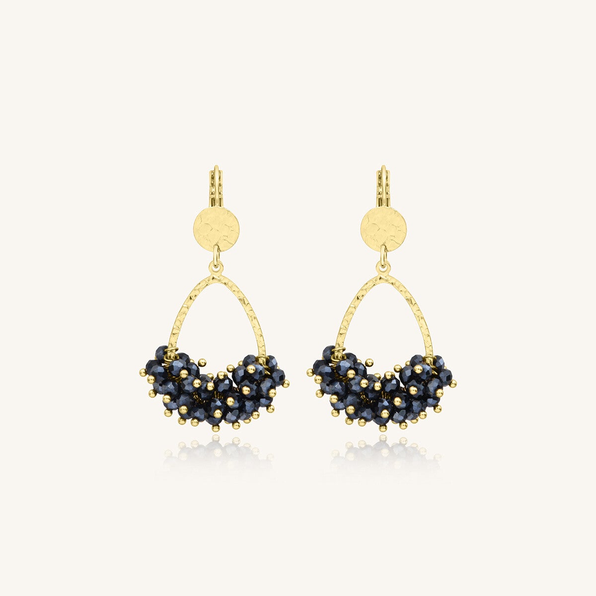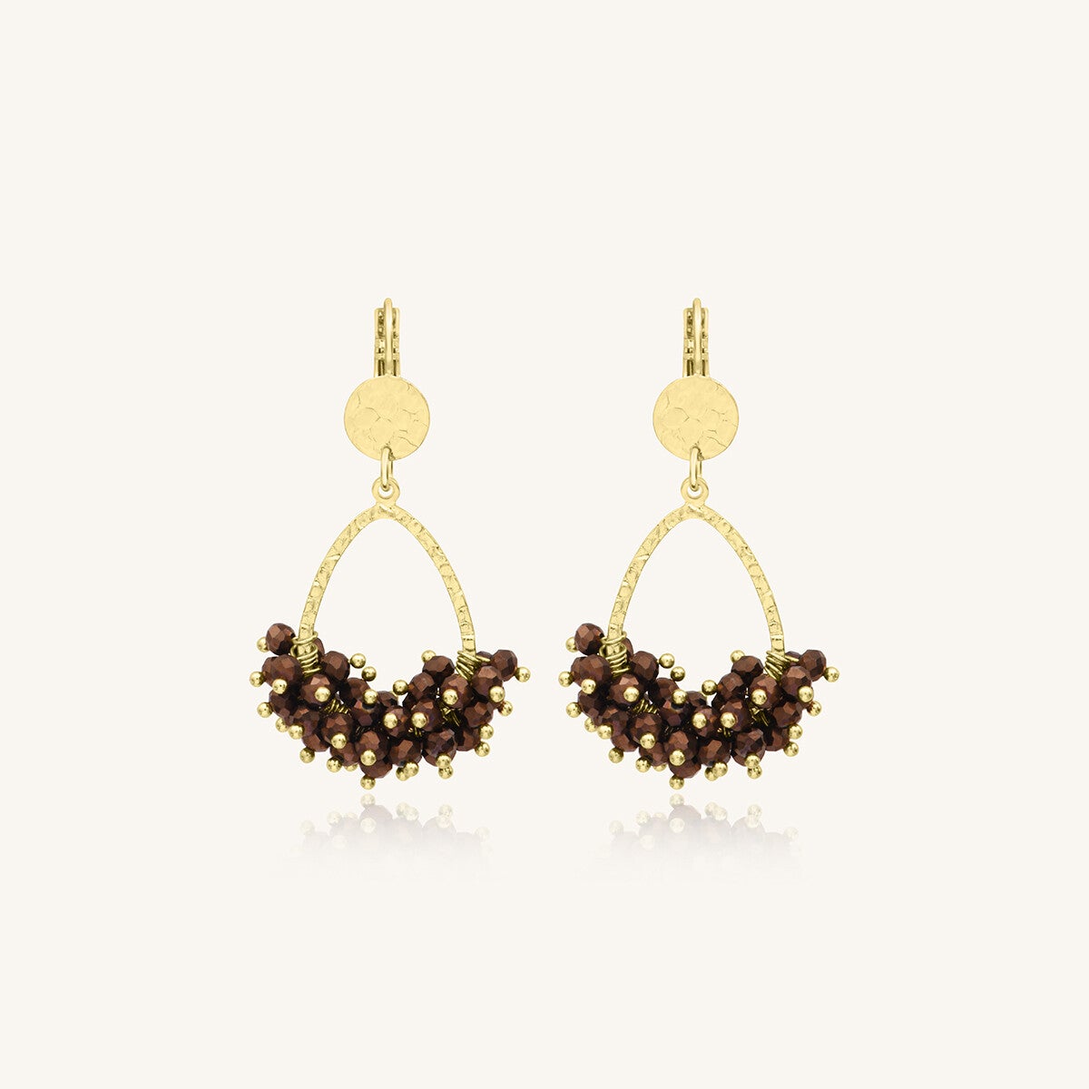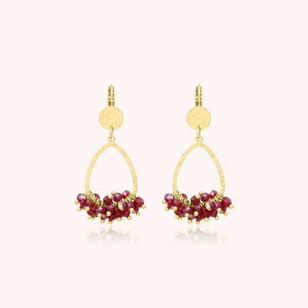 De Mini Flora Prune oorbellen combineren de glans van gefacetteerde parels met de finesse van een gehamerde gouden ring. Hun fijne vorm zorgt voor een prachtige beweging bij elk gebaar en verlicht het gezicht met een kleurrijke en warme touch.