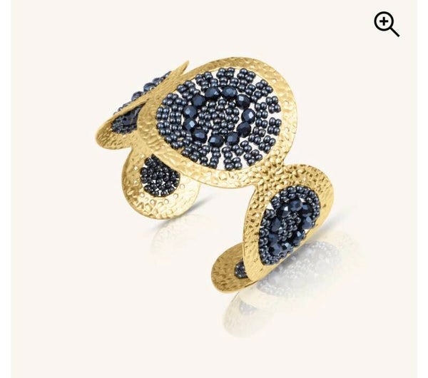 Een mooi gehamerde basis, met de hand geweven dankzij een transparante draad die de gekleurde kralen en kristallen met elkaar verbindt.