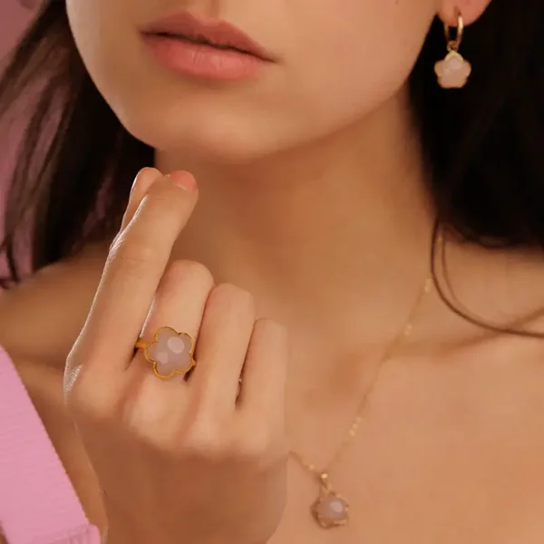 Deze gouden bloemenring met rozenkwarts is ontworpen als een speels statement piece. De bloemvormige zetting van ca. 1.5 cm geeft de ring een opvallende en vrolijke uitstraling, terwijl de zachte roze edelsteen zorgt voor balans en elegantie. Het design combineert speelsheid met verfijning en is perfect voor wie graag iets bijzonders draagt. Dankzij het gebruik van stainless steel met 14K gold plating is de ring duurzaam en geschikt voor dagelijks gebruik. Draag hem solo voor impact of combineer met subtielere ringen voor contrast