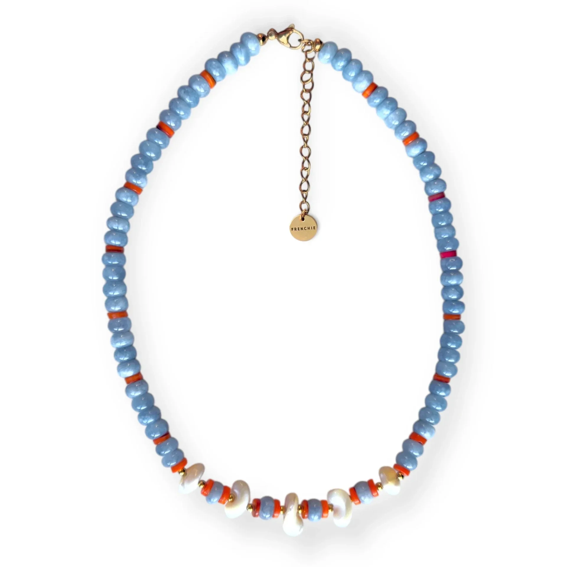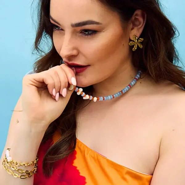 Deze zomerse kralenketting is gemaakt van natuursteen gecombineerd met schelpkralen. De gouden details en de sluiting zijn van stainless steel.