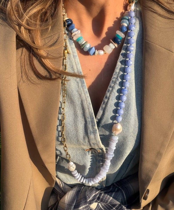 Gemaakt van aquamarijn, agaat, zoetwaterparels, bergkristal, glaskralen en resin
