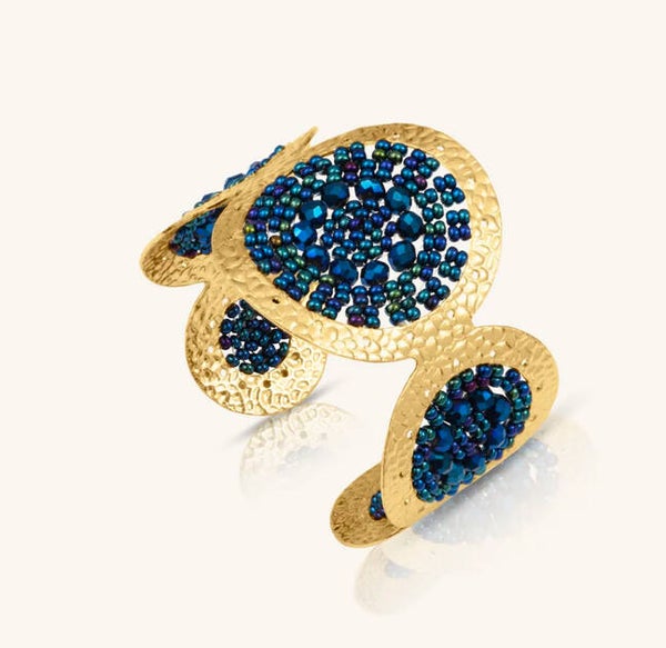 Deze prachtige handgemaakte manchette van Santibé byoux is gemaakt van kleine kraaltjes die in een kader met de hand genaaid worden. Verschillende technieken worden gebruikt waaronder macrame, naaien en weven. Je bent verzekerd van een uniek sieraad.